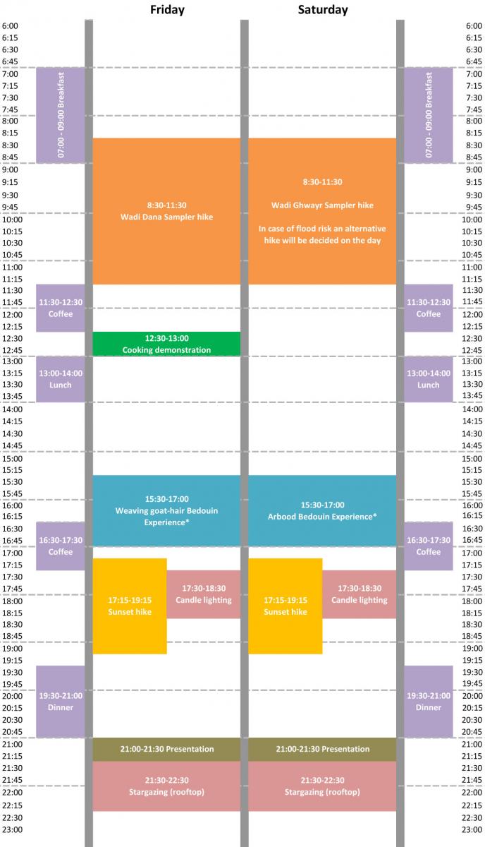 The schedule below is for the holy month of Ramadan. Please note that during that period the guided hikes and Bedouin experiences are limited. “A day with a shepherd” activity is not available. Guided activities are included in the price of your stay, but there is a small supplement for activities involving the local community - this money goes directly to the family hosting you.